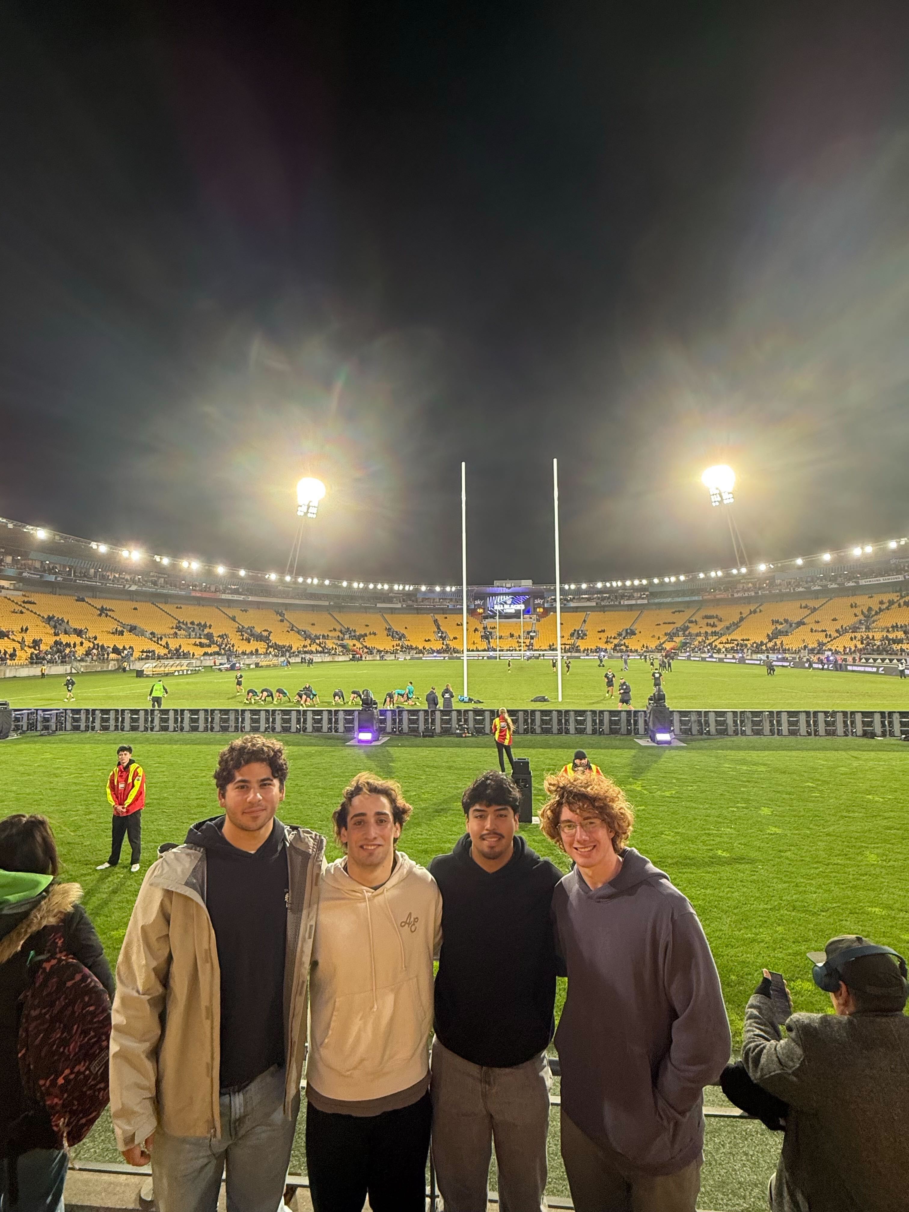 After showering, eating, and changing, we had a pretty quick turnaround to the All Blacks test match which we would be attending in person that evening. We met up with our teammate Arjey before the game, and quickly began walking north to Sky Stadium. Once inside, we caught the end of the Black Ferns game, the New Zealand women’s national team, in which they put up a dominant performance over Australia. After warmups and anthems, the All Blacks performed an incredible Haka, which was special to see in person. In a very entertaining game, the All Blacks beat France 43-17, making up for their close win the week prior. In a crowded environment full of tens of thousands of All Blacks fans, and even a surprising number of France fans, seeing this game in person was a truly special experience.